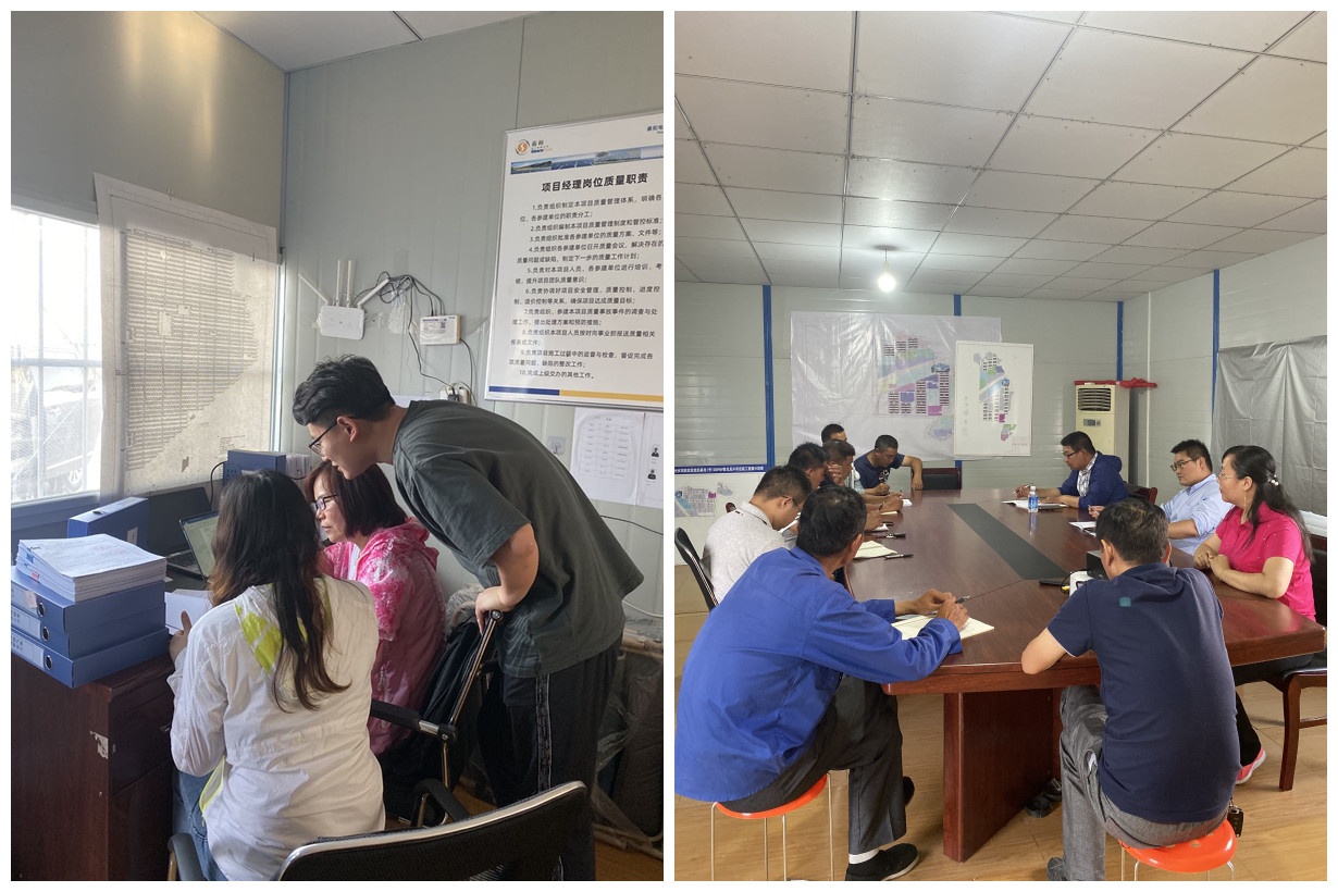 实地参观完之后,慰问组一行人回到项目部,质管部同事检查质监验收材料,卞总还参加了项目部每日工程安全进度碰头会,参与讨论了针对第二日暴雨而需加强的安全施工部署。