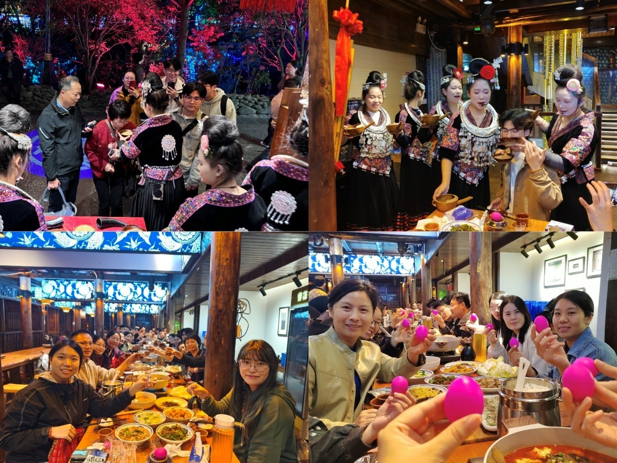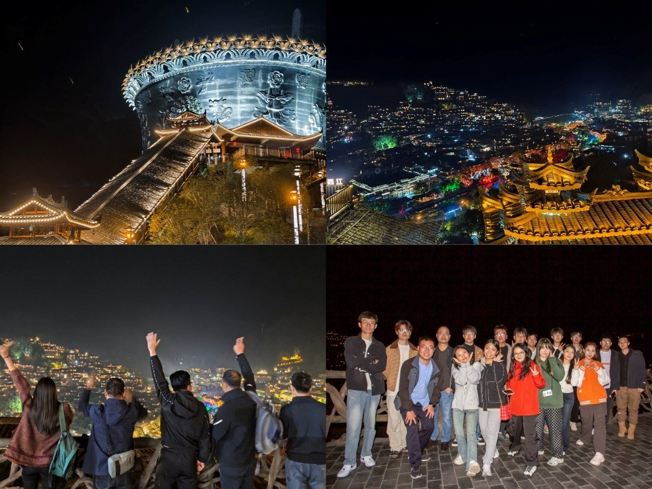 “灯火万家城四畔,星河一道水中央。”晚上,经过漫长的车程,终于抵达西江。千户苗寨的万家灯火如同繁星点点,与远处的山峦和溪流交相辉映。一排排依山而建的吊脚楼层层叠叠,错落有致。大家被这里的苗族文化深深吸引。不仅品尝了具有特色的长桌宴,还参与了苗族的歌舞表演,与苗族同胞一起载歌载舞,感受到了浓厚的民族风情。