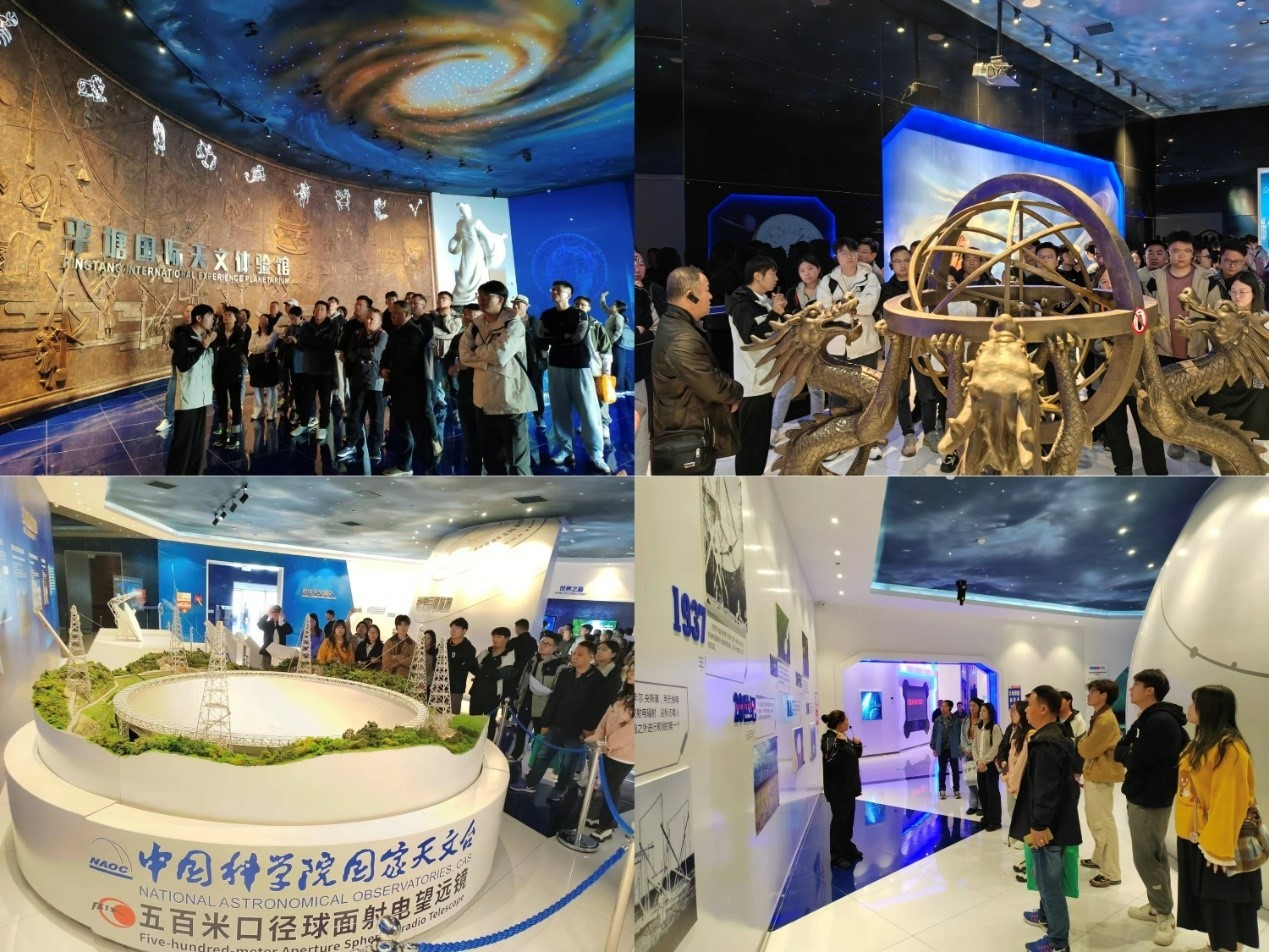 “宏伟工程创奇迹,科技智慧显神韵。”11月10日,团队前往天眼景区参观500米单口径球面射电望远镜。站上山顶观景台俯瞰,巨型科学装置镶嵌在水流溶蚀形成的大坑之中,现代机械美感与山体自然环境精妙融合,宛若天成。在这里,大家不仅听取了专业讲解,还对射电望远镜的工作原理和科研意义有了更深入的了解。