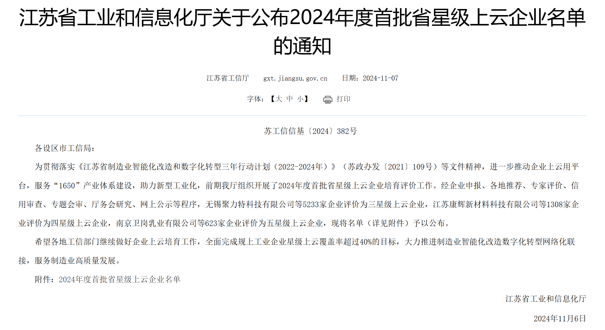 近日,江苏省工业和信息化厅印发《关于公布2024年度首批省星级上云企业名单的通知》文件,羲和电力喜获为江苏省三星级上云企业。