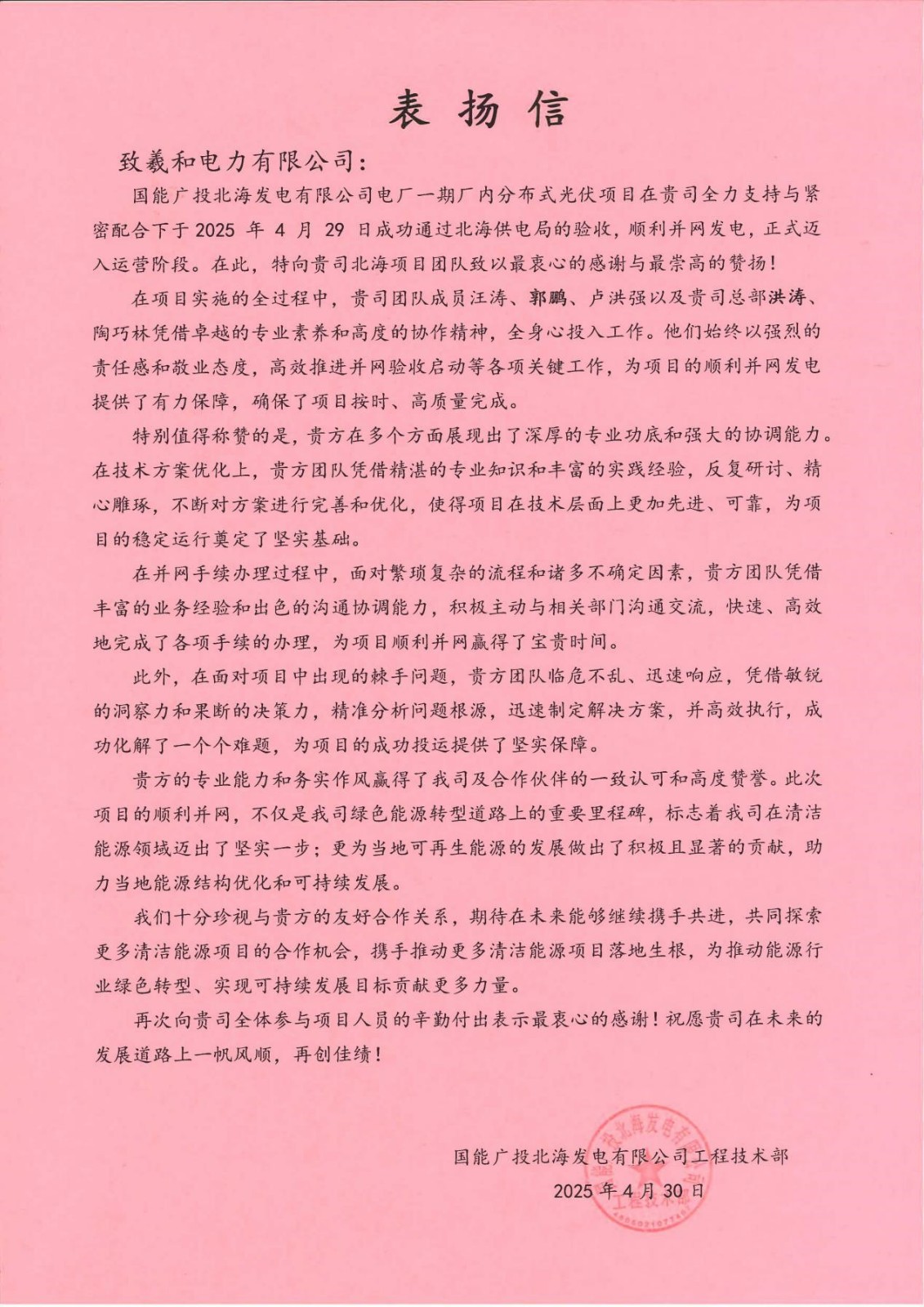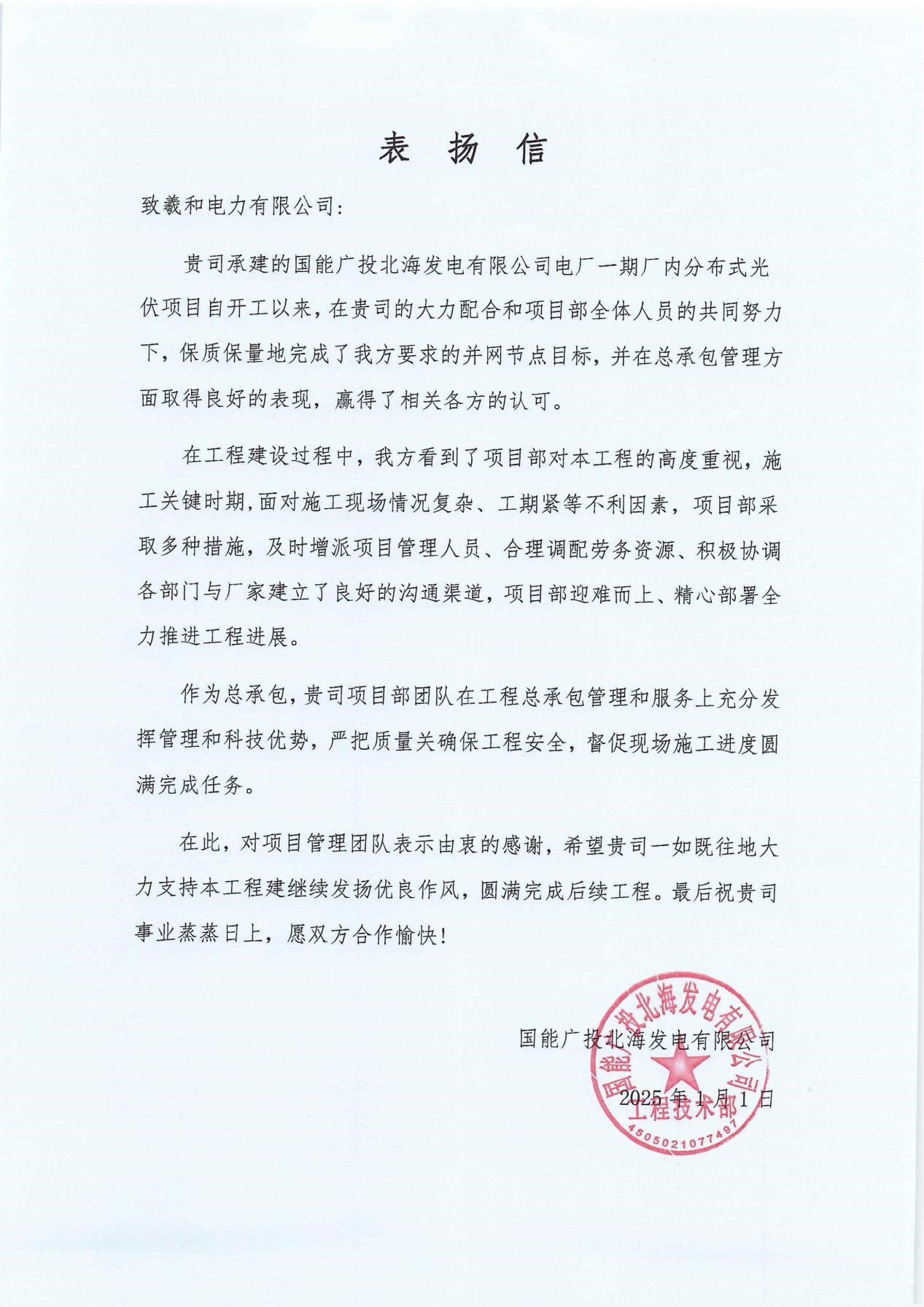 2025年4月30日再次喜获国能广投北海发电有限公司表扬信,此前2025年1月1日已获得业主表扬信。向业主表示感谢,向各参建单位表示感谢,我们将一如既往认真踏实的做好每一个项目,回报业主、回报社会。
