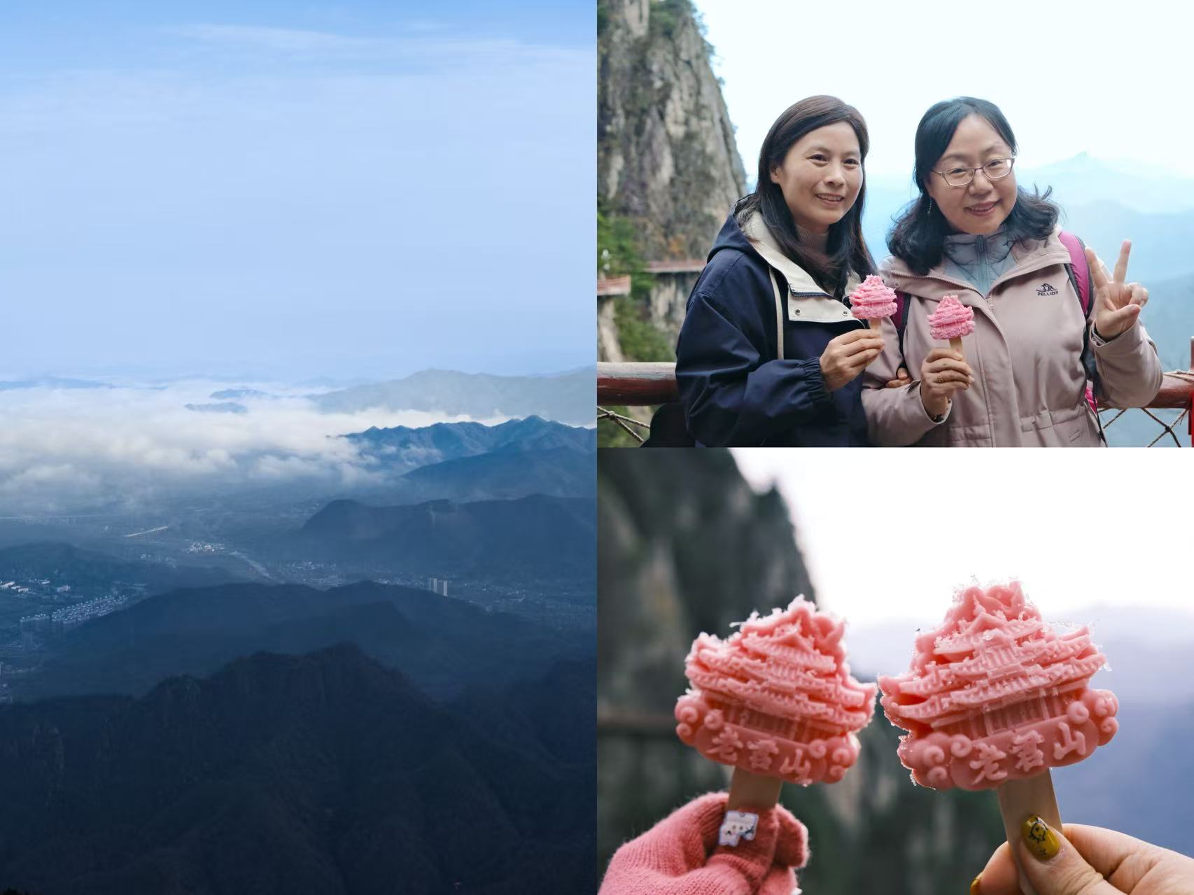 乘缆车、踏山路。抬眼间,烟纹云缕、奇岩怪石与润碧松柏尽收眼底。大家肆意呼吸山中清气,工作的忙碌顿时化作眼底的开阔,团队凝聚力在共同攀登的喜悦中悄然升温。山间夹缝处晨光渐散,立于半山腰,道家仙骨遗韵随风声拂耳,恍惚间大家似化身为山中修行者,与山石草木相融。