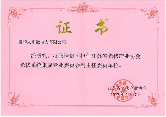 公司特聘为江苏省光伏产业协会光伏系统集成专业委员会副主任委员单位