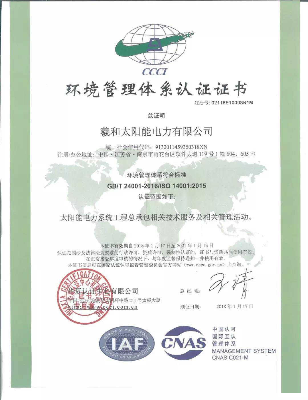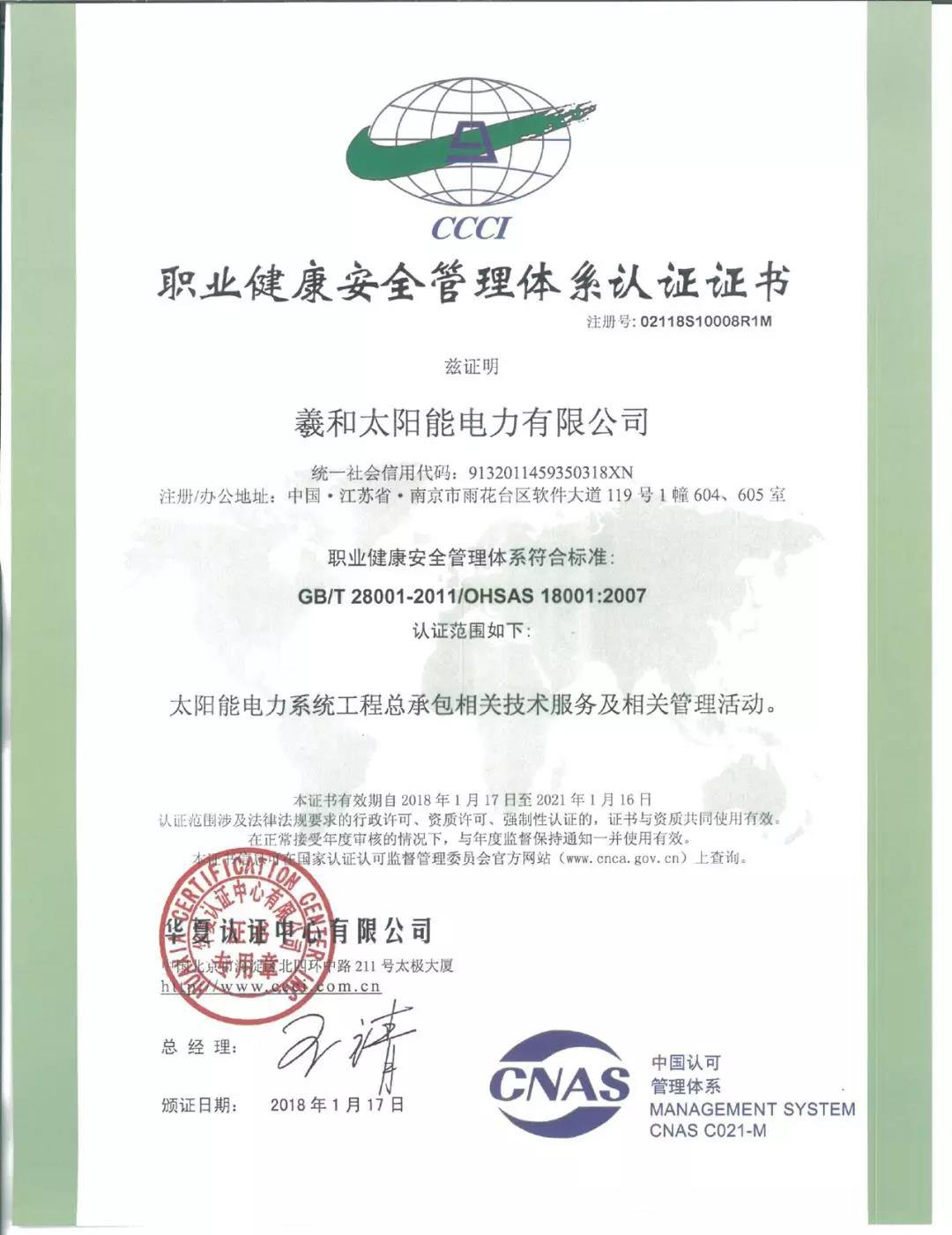 羲和太阳能电力有限公司于2017年底通过了华夏认证中心专家审核组针对三标管理体系(质量管理体系、环境管理体系、职业健康安全管理体系)进行的换版审核,并于2018年1月取得了新版认证证书。