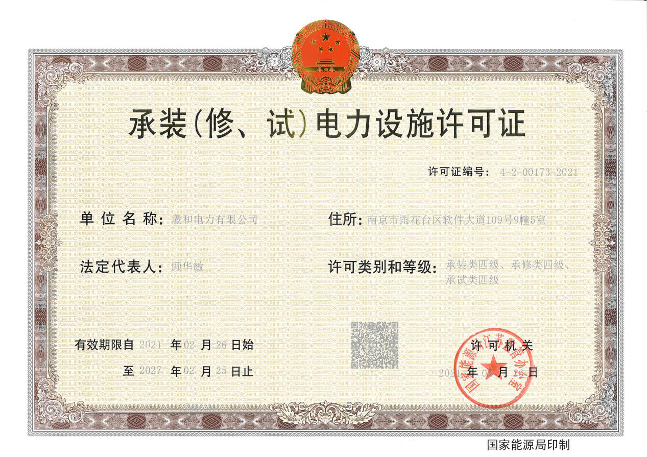 近日,经认真筹备、申报,羲和电力有限公司资质工作取得可喜成绩,顺利通过国家能源局江苏监管办公室审批,喜获承装(修、试)电力设施许可证三承四级资质(证书编号:4-2-00173-2021)证书。该资质的获取为公司后续开拓市场、发展业务奠定坚实的基础。