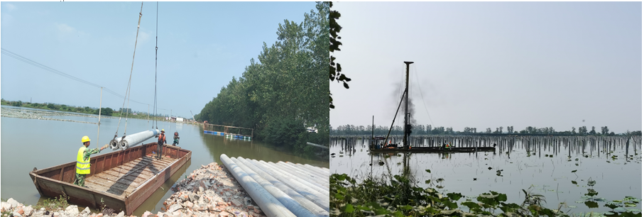 慰问团队到达常德项目现场后,抬眼望去,全都是忙忙碌碌的施工人员。为了不打扰现场人员的工作节奏,慰问组成员先自行参观了现场的建设情况,随后在董工的带领讲解下,了解现场的进度情况及施工中的遇到的难点,并与项目现场技术人员一起沟通现场事宜解决方案。该项目是渔光互补项目,在一个个荷花塘里,水深、淤泥多、任务重,但大家齐心协力,自造水中作业平台,促进度保并网,不畏艰难、勇于拼搏的决心非常坚定!