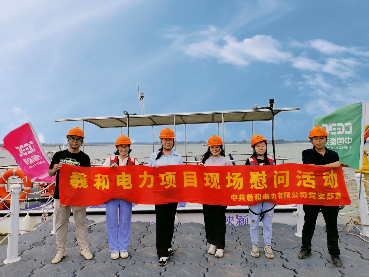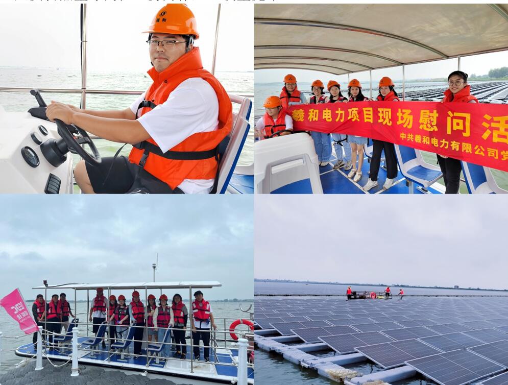 随后,由项目负责人孙经理掌舵,带着慰问团队深入作业一线,了解现场施工环境和项目进展情况,由于该项目为水上漂浮光伏项目,需要在湖面上进行作业,因此项目团队为每人都准备了救生衣,安全意识满分。彼时的湖面浪花不断,但施工人员仍然坚守岗位,努力作业,攻坚克难!