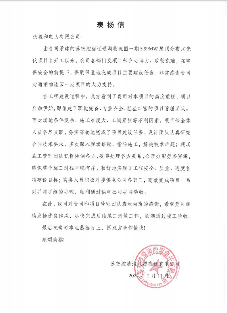 苏交控宿迁通湖物流园一期5.99MW屋顶分布式光伏项目位于江苏省宿迁市经济开发区通湖物流园,采用10KV两个并网点并网,由苏交控清洁能源宿迁有限公司投资建设。项目自2023年10月10日开工以来,在建设单位、监理单位的关心指导下,在园区的大力支持下,在公司的坚强领导下,克服工期紧、供货周期短、园区原有地下管线复杂、交通及高空坠落等安全隐患多等不利因素,于 2023年12月9日实现一次性全容量并网发电,并得到建设单位的肯定表扬!