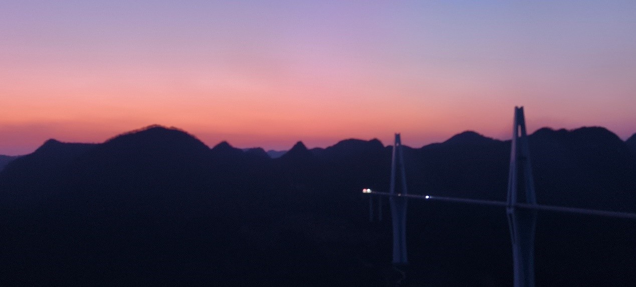 “千峰随霞光,夕照山间景。”傍晚,途径天空之桥服务区时恰逢日落之时,晚霞映照在远处的山峦上,山峰在霞光中若隐若现,仿佛披上了一层金紫色的纱衣。员工们在观景台上纷纷合影留念,记录下这一刻的美好。