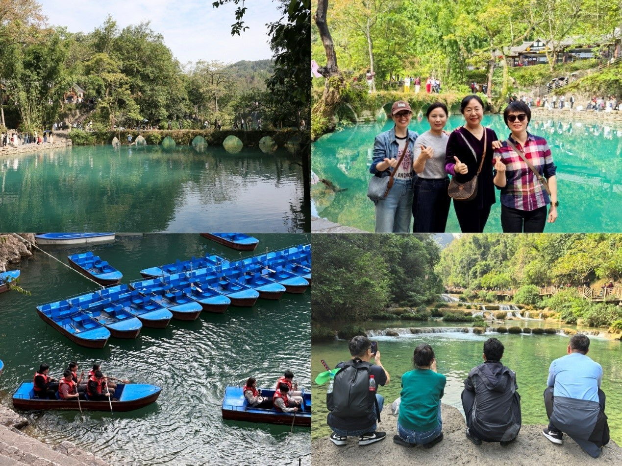 “青翠树丛石缝扎,潺潺清水淌林下。”11月9日,在小七孔景区,员工们沿着山间小道,穿梭在树林和溪流之间,欣赏瀑布的壮观、湖泊的宁静和森林的茂密。在鸳鸯湖上泛舟时,他们划动着木桨,感受着湖水的清凉与宁静,仿佛与大自然融为一体。