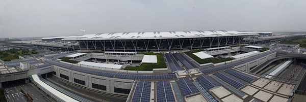 上海浦东国际机场屋顶光伏发电系统为国家光电建筑一体化示范项目,光伏方阵布置在浦东国际机场T1、T2航站楼交通中心通道的屋顶上,采用高效晶硅光伏瓦组件,与建筑统一协调,屋面按照布置区域分为8个发电单元,汇流至4个10kV/0.4kV变电站,经逆变后在低压侧并网,预计年发电量170万千瓦时。项目建成后,能有效缓解浦东国际机场的用电压力,实现节能减排,成为绿色建筑的典范之一。