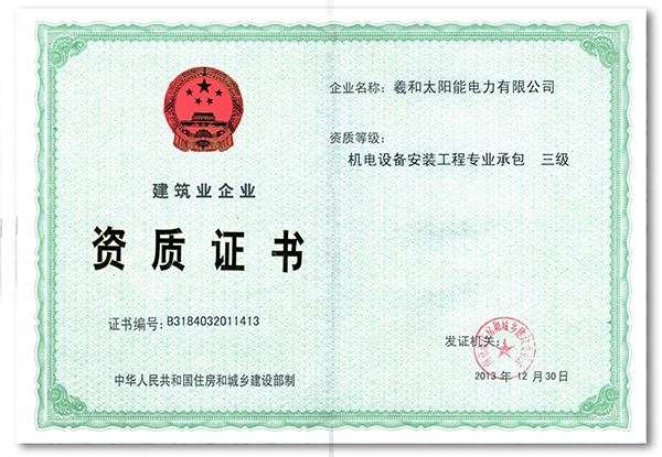 近日,经认真筹备、申报,羲和太阳能电力有限公司资质工作取得可喜成绩,顺利通过南京市住建委和江苏省住建厅审批,喜获机电设备安装工程专业承包三级资质(证书编号:B3184032011413)。该资质的获得为公司后续开拓市场、发展业务奠定坚实的基础。