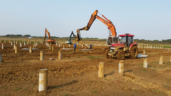 该项目为鱼塘水面电站,淤泥较深,现场施工采取“边试桩、边打桩”方式确定管桩桩长,是我司渔光互补光伏施工的再次探索和深入。