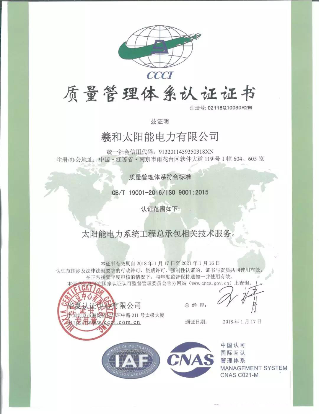 羲和太阳能电力有限公司于2017年底通过了华夏认证中心专家审核组针对三标管理体系(质量管理体系、环境管理体系、职业健康安全管理体系)进行的换版审核,并于2018年1月取得了新版认证证书。
