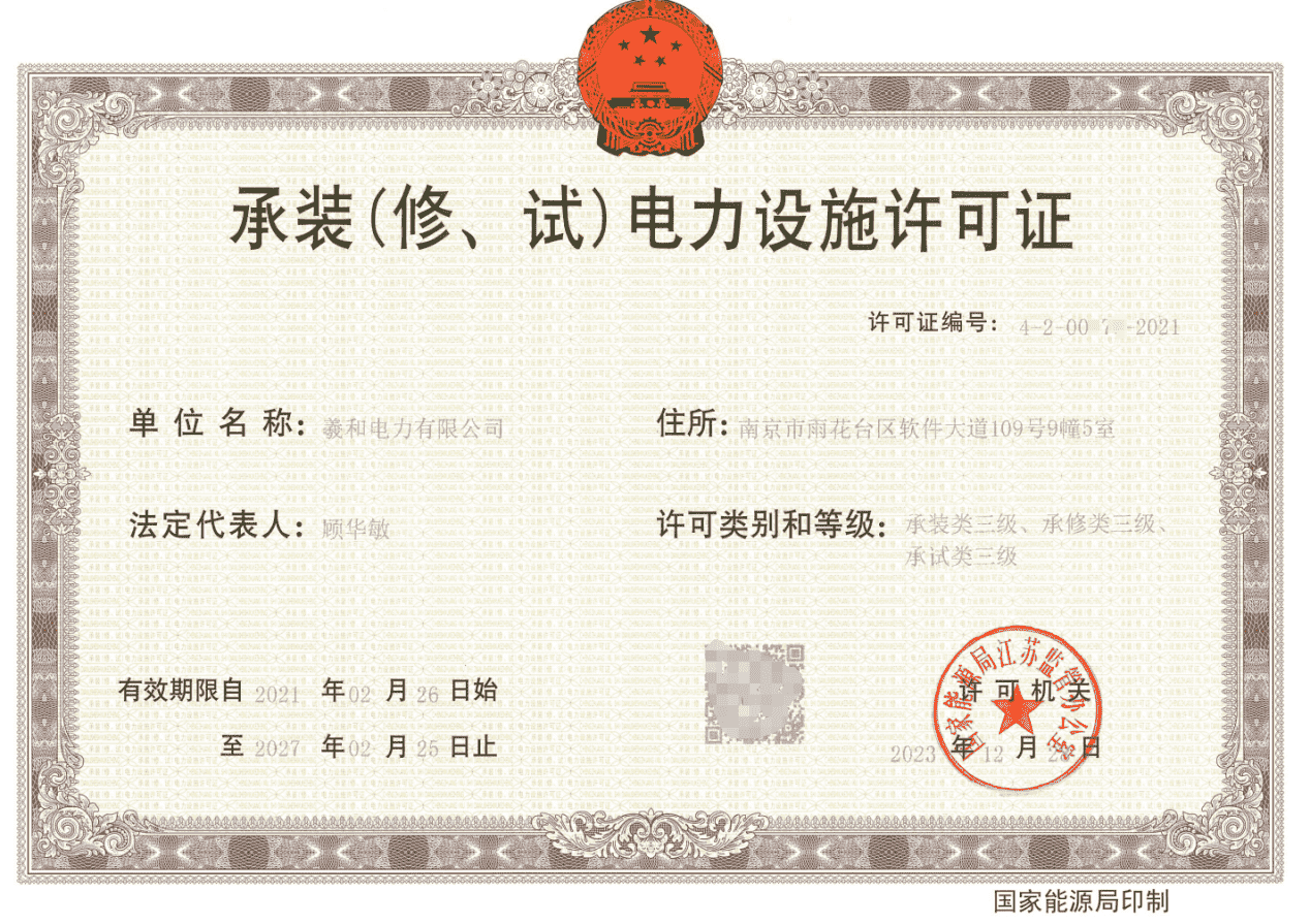 2023年12月28日,羲和电力有限公司顺利通过国家能源局江苏监管办公室审查、许可,喜获承装(修、试)电力设施许可证叁级资质。